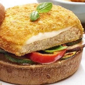 Préparation à base de protéines végétales et de fromage fondu, panée, préfrite, cuite à coeur, surgelée, 100 g.