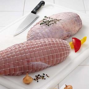 Filet de dinde,1kg, garni d'une farce à base de champignons, recouvert d'une crépine, de barde et ficelé.